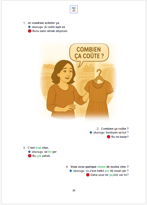 125 sayfa boyunca günlük hayatta, evde, işte, alışverişte, resmî kurumda, bankada ve daha nice durumlarda seni kurtaracak tam 340 hazır cümle + Bonus bilgiler !
